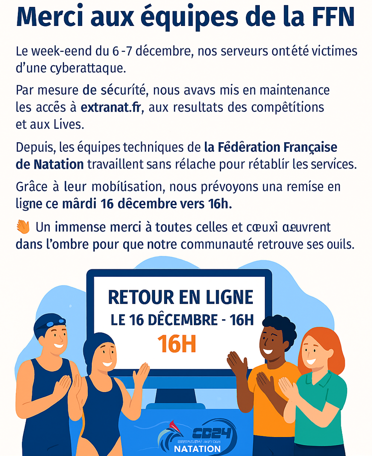 đ Nous tenons Ă adresser un grand merci aux Ă©quipes de la FFN qui travaillent sans relĂąche depuis plusieurs jours pour rĂ©tablir lâinformatique et permettre Ă chacun de retrouver rapidement ses outils.