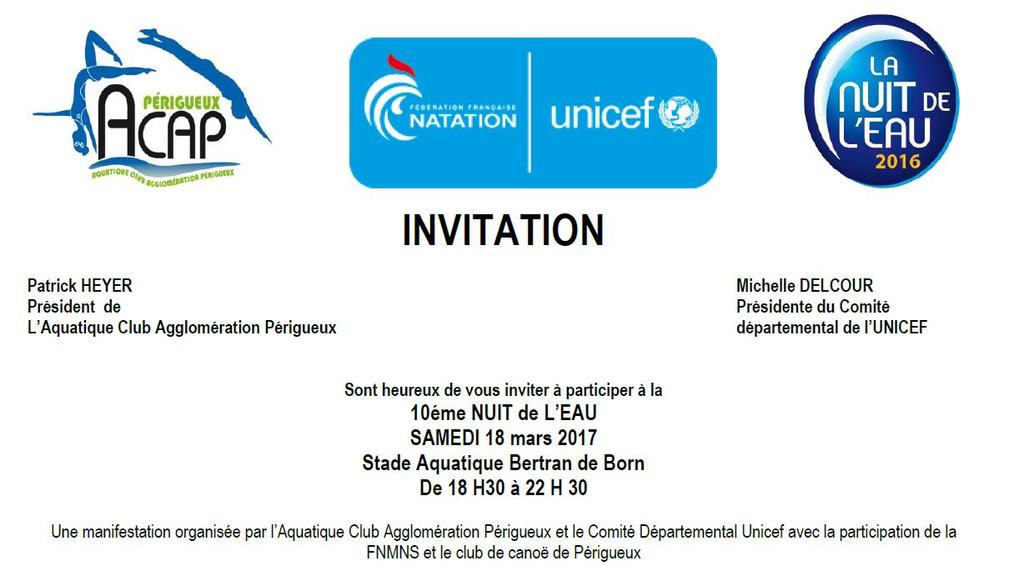 La 10 ème édition de la Nuit de l'eau se déroulera le 18 mars 2017 partout en France et notamment de 18h30 à 22h30 à la piscine Bertran de Born de Périgueux. Il s'agit d'une opération nationale initiée par la Fédération Française de Natation (FFN) et l'UNICEF au profit, cette année, des enfants d'Haïti et plus particulièrement au financement de programme de développement en faveur de l'eau.